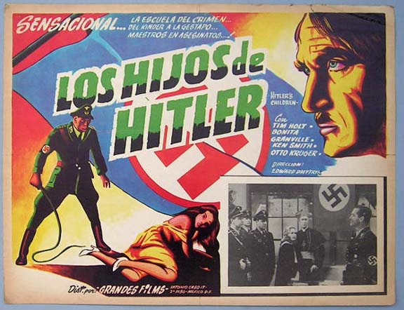 Beautiful Mexican jumbo lobby card (12.5x16.5") from the 1943 RKO war / WW2 film, HITLER'S CHILDREN, which starred Tim Holt, Bonita Granville, Kent Smith, Otto Kruger and H.B. Warner. There is a crease/tear near the upper right corner, but this is not very distracting. Otherwise, the colors are bright and the card will display very well. $25 each |