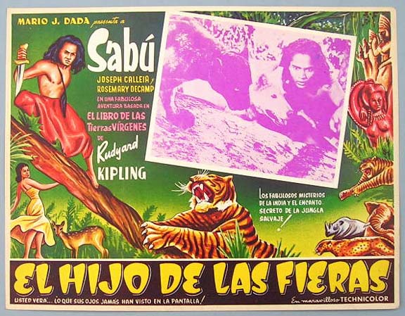 Beautiful Mexican jumbo lobby card (12.5x16.5") from the 1942 United Artists fantasy / adventure film, THE JUNGLE BOOK, which starred Sabu, Joseph Calleia, John Qualen, Frank Puglia, Rosemary DeCamp, Patricia O'Rourke and Ralph Byrd. $25 each |