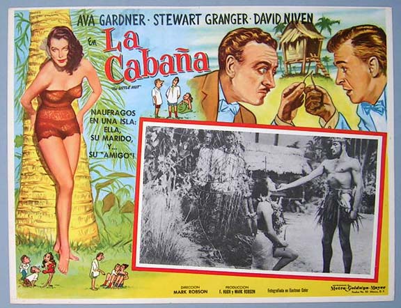 Beautiful Mexican jumbo lobby card (12.5x16.5") from the 1957 MGM comedy film, THE LITTLE HUT, which starred Ava Gardner, Stewart Granger, David Niven and Walter Chiari. $25 each |