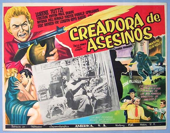 Beautiful Mexican jumbo lobby card (12.5x16.5") from the 1960 Screen Classics crime / gangster film, MA BARKER'S KILLER BROOD, which starred Lurene Tuttle, Tristram Coffin, Paul Dubov, Nelson Leigh, Myrna Dell, Victor Lundin and Don Grady. $20 each |