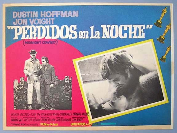 Beautiful Mexican jumbo lobby card (12.5x16.5") from the 1969 United Artists drama film, MIDNIGHT COWBOY, which starred Dustin Hoffman, Jon Voight, Sylvia Miles, John McGiver and Brenda Vaccaro. $15 each |