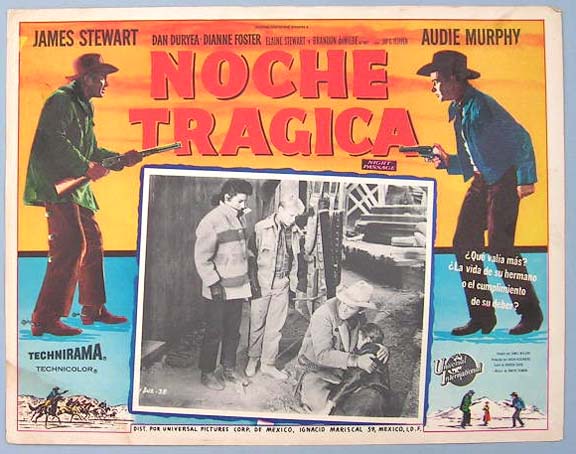 Beautiful Mexican jumbo lobby card (12.5x16.5") from the 1957 Universal western film, NIGHT PASSAGE, which starred James Stewart, Audie Murphy, Dan Duryea, Dianne Foster, Elaine Stewart and Brandon De Wilde. $20 each |