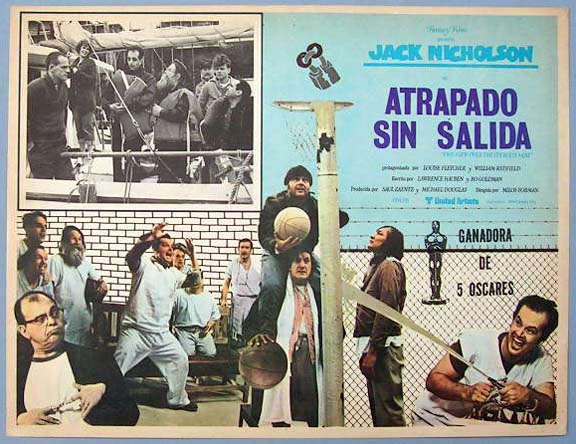 Beautiful Mexican jumbo lobby card (12.5x16.5") from the 1975 United Artists drama / comedy film, ONE FLEW OVER THE CUCKOO'S NEST, which starred Jack Nicholson, Louise Fletcher, Will Sampson, Christopher Lloyd, William Redfield, Sydney Lassick and Danny DeVito. $35 each |