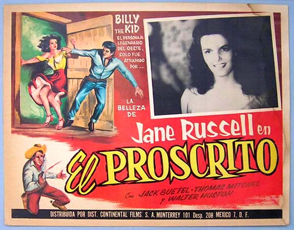 Beautiful Mexican jumbo lobby card (12.5x16.5") from the 1943 RKO western / romance film, THE OUTLAW, which starred Jack Beutel, Jane Russell, Thomas Mitchell, Walter Huston, Mimi Aguglia and Joe Sawyer. The cards have some water marks / discoloration along the right edge, but this flaw is not very distracting. Otherwise, the colors are bright and the card will display very well. $25 each |