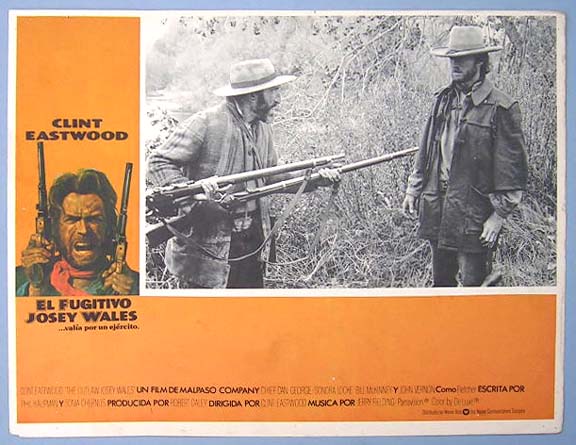 Beautiful Mexican jumbo lobby card (12.5x16.5") from the 1976 Warner Brothers western film, THE OUTLAW JOSEY WALES, which starred Clint Eastwood, Chief Dan George, Sondra Locke, Bill McKinney and John Vernon. $15 each |