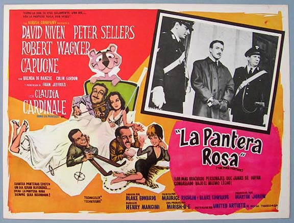 Beautiful Mexican jumbo lobby card (12.5x16.5") from the 1964 United Artists crime / comedy film, THE PINK PANTHER, which starred David Niven, Peter Sellers, Robert Wagner, Capucine, Fran Jeffries and Claudia Cardinale. $25 each |