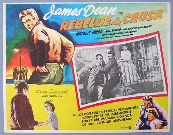 Beautiful Mexican jumbo lobby card (12.5x16.5") from the 1955 Warner Brothers JD film, REBEL WITHOUT A CAUSE, which starred James Dean, Natalie Wood, Sal Mineo, Jim Backus, Ann Doran and Corey Allen. $45 each |