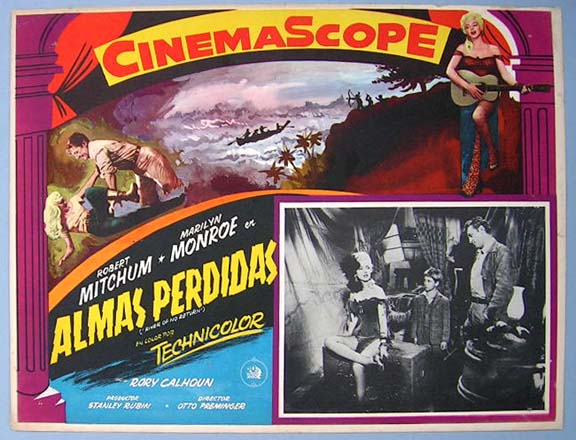 Beautiful Mexican jumbo lobby card (12.5x16.5") from the 1954 20th Century Fox western / suspense film, RIVER OF NO RETURN, which starred Marilyn Monroe, Robert Mitchum, Rory Calhoun, Tommy Rettig and Murvyn Vye. Marilyn scenes - $35 .... Other cards - $20 each |