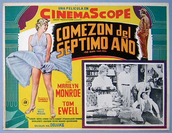 Beautiful Mexican jumbo lobby card (12.5x16.5") from the 1955 20th Century Fox comedy film, THE SEVEN YEAR ITCH, which starred Marilyn Monroe, Tom Ewell, Evelyn Keyes, Sonny Tufts and Robert Strauss. The film was directed by Billy Wilder. Marilyn scenes - $65 each ... Other cards $45 each |