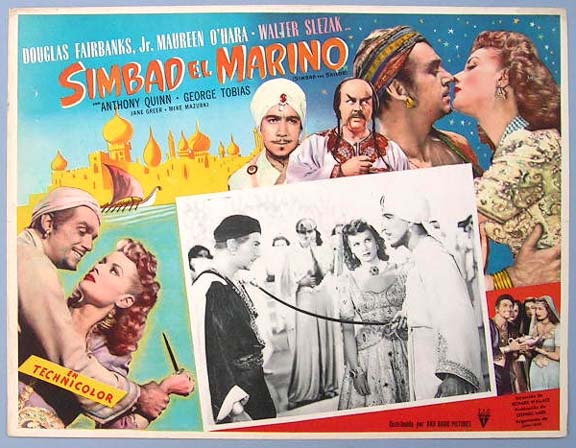 Beautiful Mexican jumbo lobby card (12.5x16.5") from the 1947 RKO swashbuckler / adventure film, SINBAD THE SAILOR, which starred Douglas Fairbanks Jr., Maureen O'Hara, Walter Slezak, Anthony Quinn, George Tobias and Jane Greer. $20 each |
