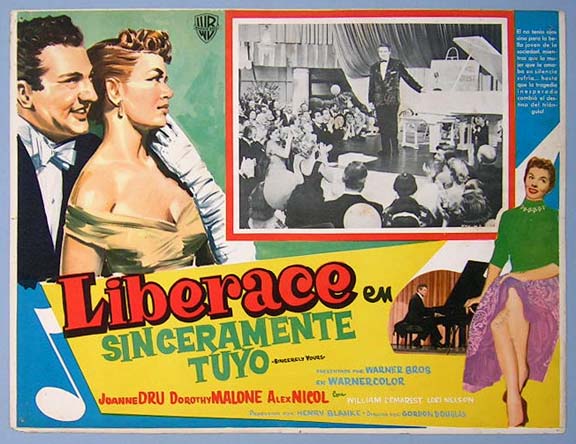 Beautiful Mexican jumbo lobby card (12.5x16.5") from the 1955 Warner Brothers musical / romance film, SINCERELY YOURS, which starred Liberace, Joanne Dru, Dorothy Malone, Alex Nicol, William Demarest and Lori Nelson. $20 each |