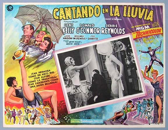 Beautiful Mexican jumbo lobby card (12.5x16.5") from the 1952 MGM musical / comedy / romance film, SINGIN' IN THE RAIN, which starred Gene Kelly, Donald O'Connor, Debbie Reynolds, Jean Hagen, Millard Mitchell and Cyd Charisse. $35 each |