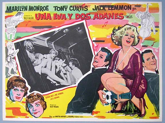Beautiful Mexican jumbo lobby card (12.5x16.5") from the 1959 United Artists comedy / gangster film, SOME LIKE IT HOT, which starred Marilyn Monroe, Tony Curtis, Jack Lemmon, George Raft, Pat O'Brien and Joe E. Brown. Marilyn scenes - $65 each ... Other cards $45 each |