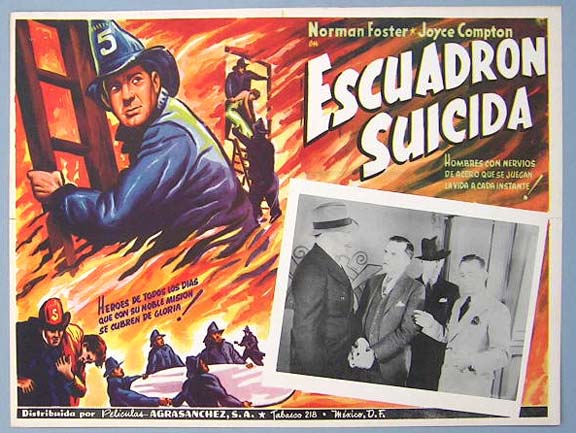 Beautiful Mexican jumbo lobby card (12.5x16.5") from the 1935 Puritan Pictures fire fighting film, SUICIDE SQUAD, which starred Norman Foster, Joyce Compton, Robert Homans and Aggie Herring. $25 each |