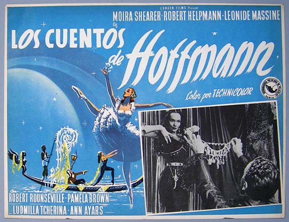 Beautiful Mexican jumbo lobby card (12.5x16.5") from the 1951 British musical / romance / fantasy film, THE TALES OF HOFFMANN, which starred Moira Shearer, Robert Rounseville, Robert Helpmann, Pamela Brown, Frederick Ashton and Ludmilla Tcherina. The film was directed by Michael Powell and Emeric Pressburger. $25 each |