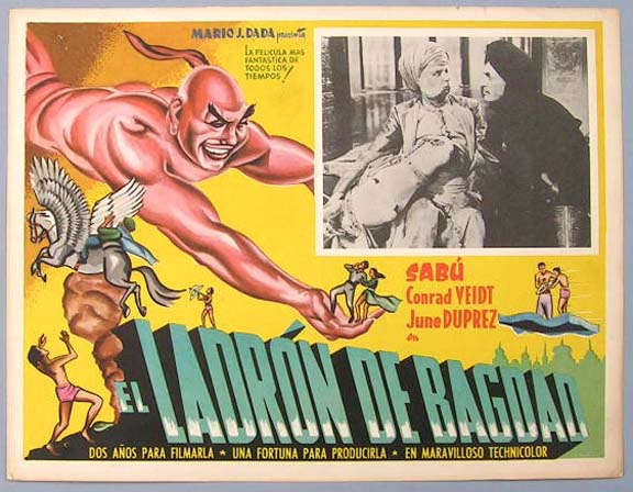 Beautiful Mexican jumbo lobby card (12.5x16.5") from the 1940 British adventure / fantasy / Swashbuckler film, THE THIEF OF BAGHDAD, which starred Conrad Veidt, Sabu, June Duprez, John Justin and Rex Ingram. $35 each |