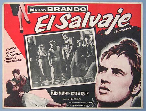 Beautiful Mexican lobby card (11x14") from the 1954 Columbia motorcycle / JD / biker film, THE WILD ONE, which starred Marlon Brando, Mary Murphy, Robert Keith, Lee Marvin and Jay C. Flippen. $25 each |