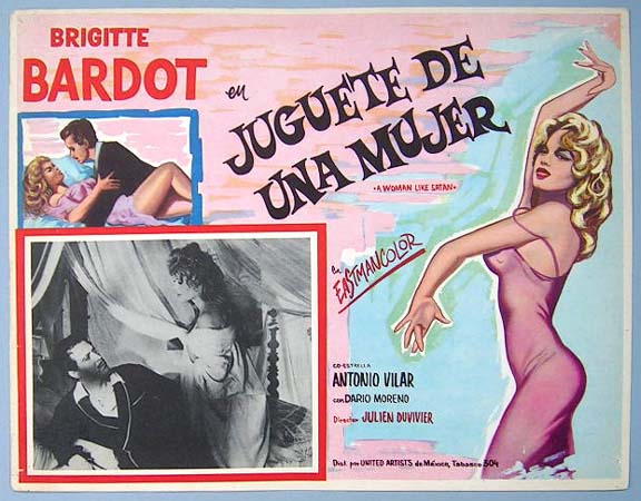 Beautiful Mexican jumbo lobby card (12.5x16.5") from the 1959 French / Lopert film, A WOMAN LIKE SATAN, which starred Brigitte Bardot, Rivers Cadet, Espanita Cortez and Claude Goddard. $25 each |