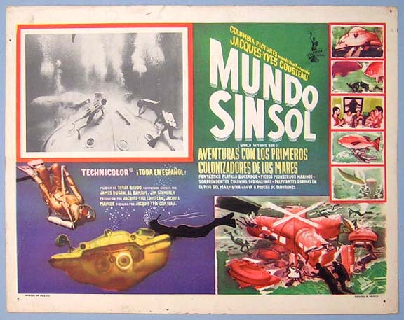 Beautiful Mexican lobby card (11x14") from the 1964 Columbia scuba diving / undersea documentary film, WORLD WITHOUT SUN, which featured the exploits of marine scientist Jacques Yves Cousteau. $20 each |