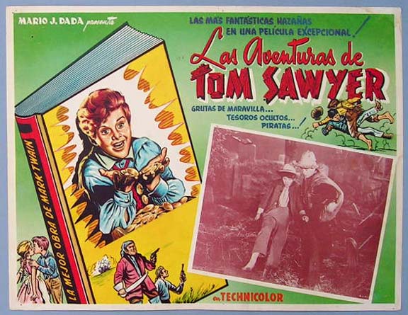 Beautiful Mexican jumbo lobby card (12.5x16.5") from the 1938 United Artists family film, THE ADVENTURES OF TOM SAWYER, which starred Tommy Kelly, Jackie Moran, Ann Gillis, May Robson, Walter Brennan, Victor Jory and David Holt. $20 each |