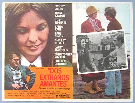 Beautiful Mexican jumbo lobby card (12.5x16.5") from the 1977 MGM comedy / romance film, ANNIE HALL, which starred Woody Allen, Diane Keaton, Tony Roberts, Carol Kane, Paul Simon, Shelley Duvall, Janet Margolin, Colleen Dewhurst, Christopher Walken and Donald Symington. The film was directed by Woody Allen. $15 each |