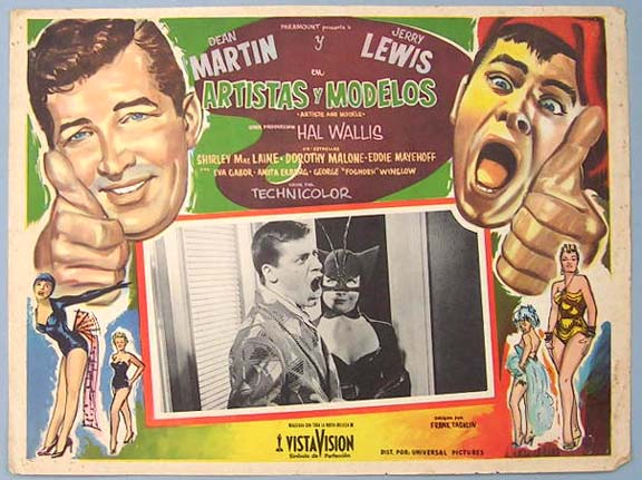 Beautiful Mexican jumbo lobby card (12.5x16.5") from the 1955 Paramount musical comedy film, ARTISTS AND MODELS, which starred Dean Martin, Jerry Lewis, Shirley MacLaine, Dorothy Malone and Anita Ekberg. $15 each |