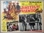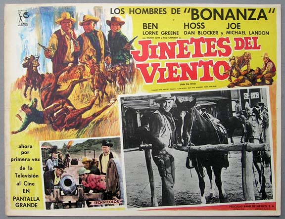 Beautiful Mexican jumbo lobby card (12.5x16.5") from a feature film release of the 1959 NBC TV western series, BONANZA, which starred Lorne Greene, Michael Landon, Dan Blocker, Victor Jory and Rod Cameron. This film was compiled from episodes of the BONANZA TV show -- which were reedited and released theatrically in foreign countries. $25 each |