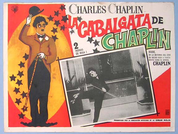 Beautiful Mexican jumbo lobby card (12.5x16.5") from an unidentified comedy compilation film, featuring the films of Charlie Chaplin. $20 each |