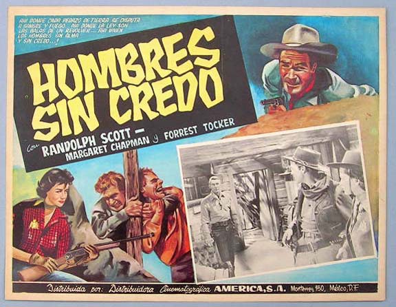 Beautiful Mexican jumbo lobby card (12x15") from the 1948 Columbia western film, CORONER CREEK, which starred Randolph Scott, Marguerite Chapman, George Macready, Sally Eilersm and Edgar Buchanan. $20 each |
