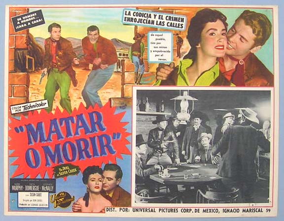 Beautiful Mexican jumbo lobby card (12.5x16.5") from the 1952 Universal western film, THE DUEL AT SILVER CREEK, which starred Audie Murphy, Faith Domergue, Stephen McNally, Susan Cabot and Gerald Mohr. $25 each |