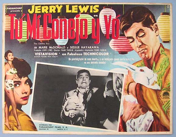 Beautiful Mexican jumbo lobby card (12.5x16.5") from the 1958 Paramount comedy / magician / baseball film, THE GEISHA BOY, which starred Jerry Lewis, Nobu McCarthy, Marie McDonald, Sessue Hayakawa, Suzanne Pleshette and The Los Angeles Dodgers. $20 each |