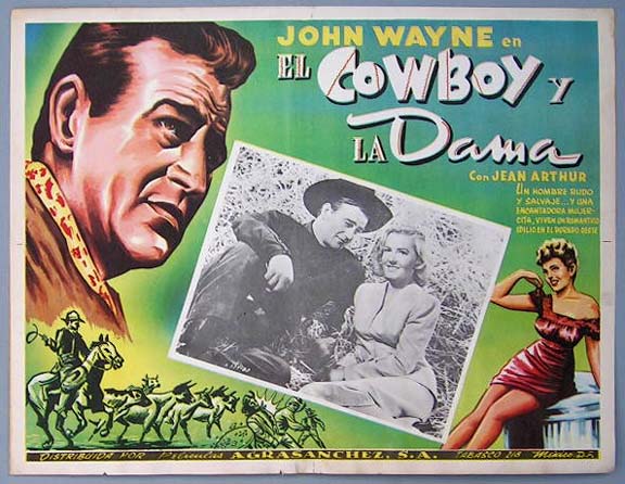 Beautiful Mexican jumbo lobby card (12.5x16.5") from the 1943 RKO western / comedy / romance film, LADY TAKES A CHANCE, which starred Jean Arthur, John Wayne, Charles Winninger, Phil Silvers and Mary Field. The card is a bit wavy along the bottom, but this minor flaw is not very distracting. Otherwise, the card is clean and bright. $20 each |