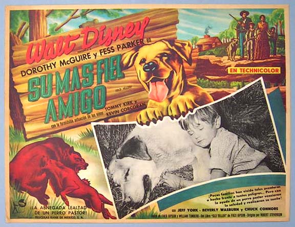 Beautiful Mexican jumbo lobby card (12.5x16.5") from the 1957 Disney family / canine film, OLD YELLER, which starred Dorothy McGuire, Fess Parker, Jeff York, Chuck Connors, Beverly Washburn, Tommy Kirk and Kevin Corcoran. $35 each |