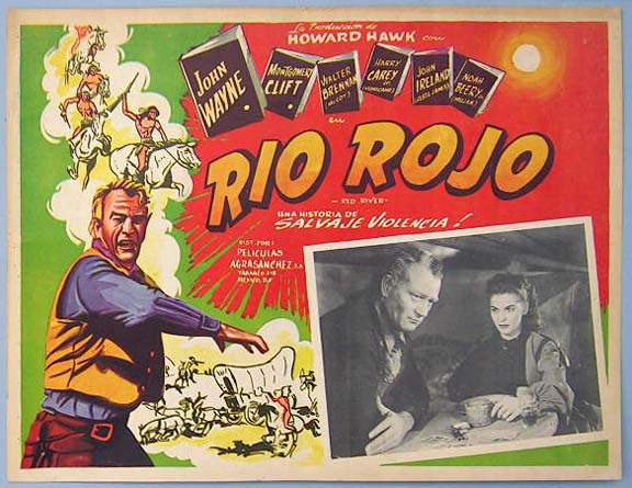 Beautiful Mexican jumbo lobby card (12x15.5") from the 1948 United Artists western film, RED RIVER, which starred John Wayne, Montgomery Clift, Joanne Dru, Walter Brennan, Coleen Gray and Harry Carey. The film was directed by Howard Hawks. $25 each |