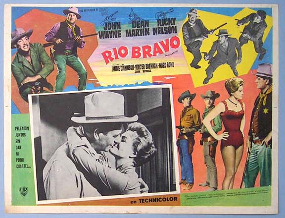Beautiful Mexican jumbo lobby card (12.5x16.5") from the 1959 Warner Brothers western film RIO BRAVO, which starred John Wayne, Dean Martin, Ricky Nelson, Angie Dickinson, Walter Brennan and Ward Bond. The film was directed by Howard Hawks. $35 each |