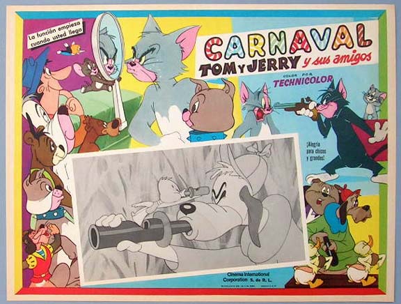 Beautiful Mexican jumbo lobby card (12.5x16.5") from the 1960s animated film, Tom and Jerry Carnival. We believe this was a compilation movie with some of the character's classic cartoons, but we're not sure of the exact release date. It could be from the late 1950s through 1960s. $20 each |