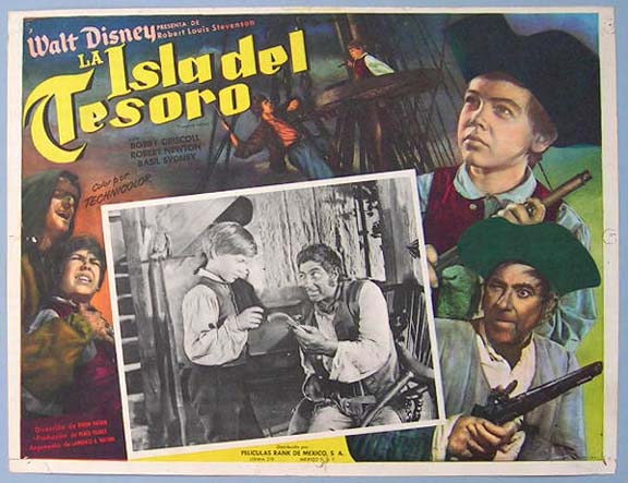 Beautiful Mexican jumbo lobby card (12.5x16.5") from the 1950 Disney / RKO adventure film, TREASURE ISLAND, which starred Bobby Driscoll, Robert Newton, Basil Sydney, Walter Fitzgerald, Denis O'Dea and Finlay Currie. $20 each |