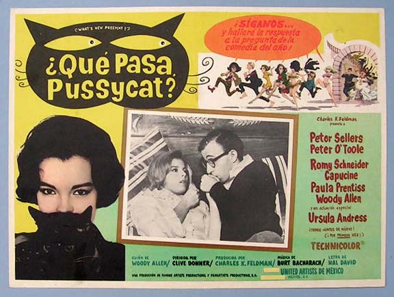 Beautiful Mexican jumbo lobby card (12.5x16.5") from the 1965 United Artists comedy film, WHAT'S NEW PUSSYCAT, which starred Peter Sellers, Peter O'Toole, Romy Schneider, Capucine, Paula Prentiss, Woody Allen and Ursula Andress. $15 each |