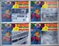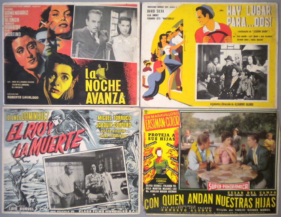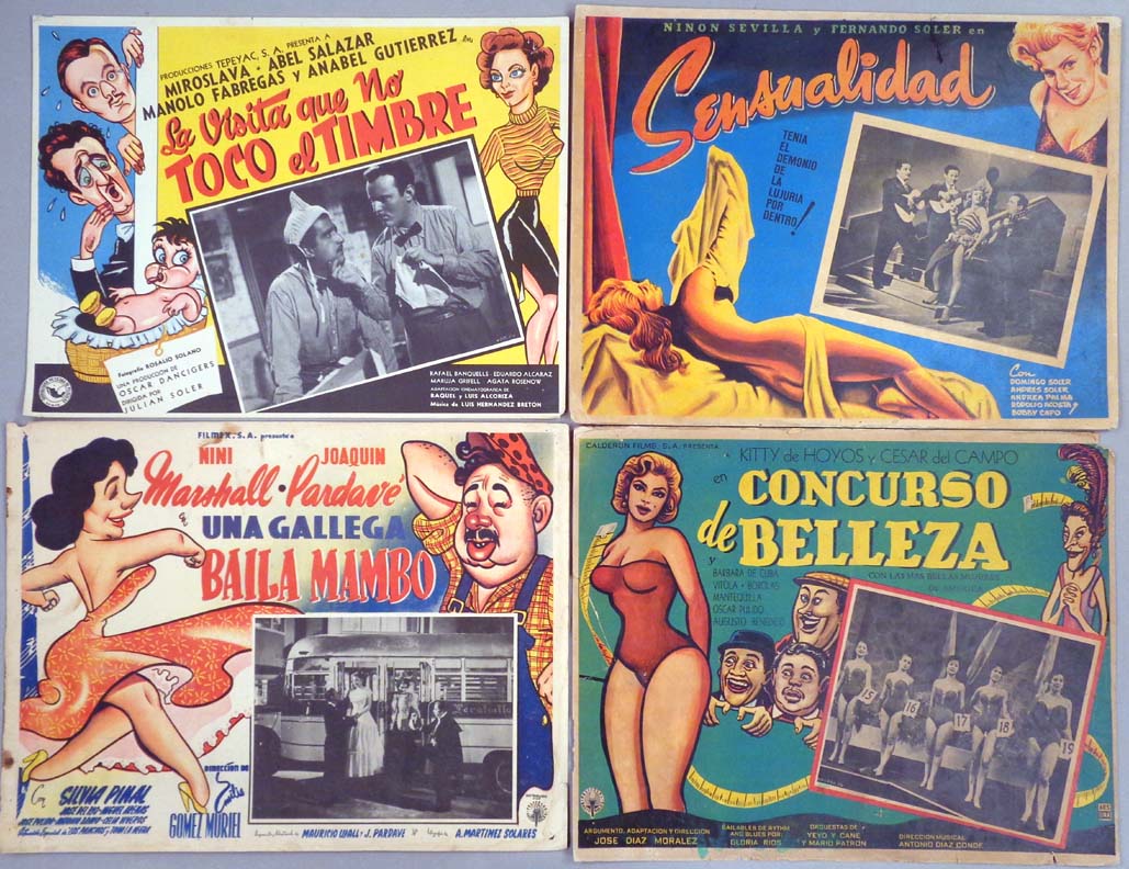 Colorful set of 4 Mexican film lobby cards which feature colorful artwork and great glossy inset scenes picturing the main stars. You get all 4 cards for one low price! (Any glare visible in the photo was caused by a problem with our camera -- it is not a flaw on the cards themselves)... This movie starred Amparo Rivelles, Julio Aleman, Julian Pastor, Marina Baura and Maria Teresa Rivas. $20 (for 4 cards) |