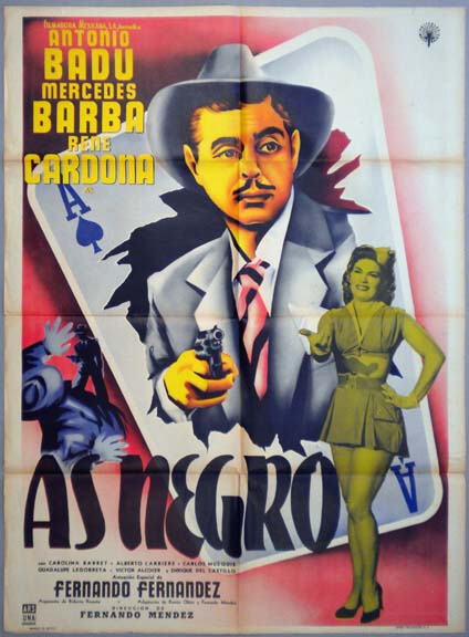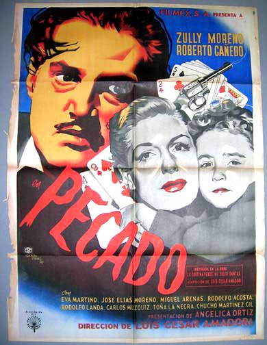 Striking noir / crime / gambling film poster features several icons of the genre -- a doomed and haunted protagonist, a deck of gambling cards, and a gun. Great style! There is some heavy wear and water damage along the left side border. However, this flaw does not greatly affect the main image area, which is clean and bright. The border could be restored fairly easily, and the poster would look excellent... This movie starred Zully Moreno, Roberto Canedo, Eva Martino, Jose Elias Moreno and Miguel Arenas. $30 |