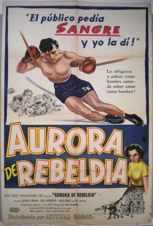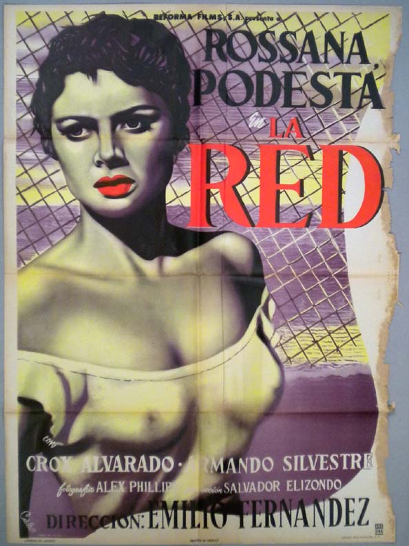 Outstanding award-winning Mexican film poster shows a very sexy image of Ms. Podesta, who is standing in front of a chain-link fence -- as if trapped in a net. A striking onesheet with vibrant color. There is some heavy water damage / wear / paper loss along the right side border, but this mainly affects only the plain border areas of the poster -- not much on the printed area -- so it would not be too difficult to restore it. Even as is, if matted and framed, the onesheet would display very well... This movie starred Rossana Podesta, Crox Alvarado, Armando Silvestre, Guillermo Cramer and Carlos Riquelme. $50 |