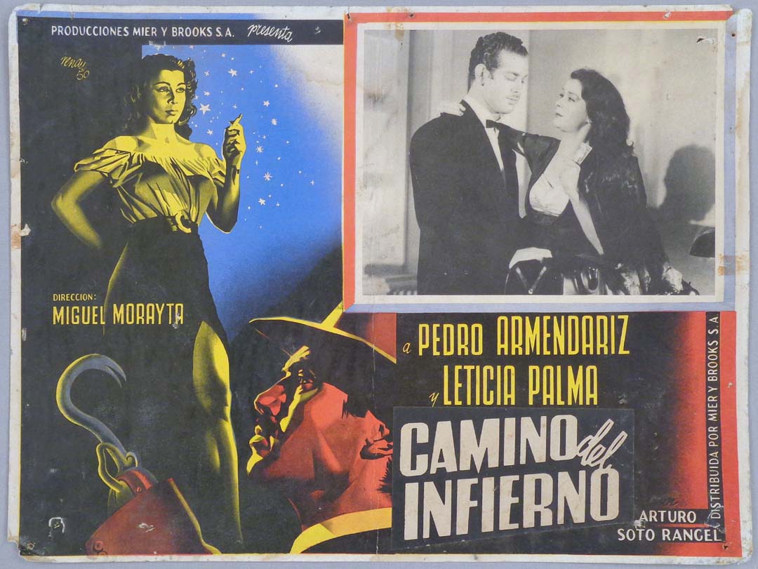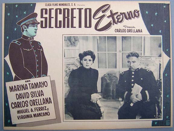 Elegant early Mexican film lobby card (9.5x13") -- from the golden age of Mexican cinema -- features stylish graphics and a nice image of the stars. There is a small chip missing from the upper right corner, but otherwise, the card is in great shape... This movie starred Marina Tamayo, Carlos Orellana, David Silva and Matilde Palou. $10 each |