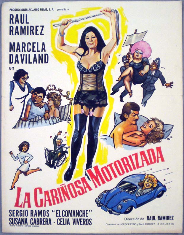 Colorful Mexican musical comedy film poster features wonderful caricatures of the four main stars -- with the three woman portrayed as hungry birds, and Muniz appearing as the worm they are chasing. The poster has some wear and repairs along the bottom fold, but this flaw is not very distracting. Otheriwse, the colors are bright and it will display well!... This movie starred Elvira Quintana, Maria Duval, Lucha Villa, Marco Antonio Muniz, Carlos Lopez Moctezuma and Jose Elias Moreno. (This poster has only limited, very mild fold lines -- so it will be sent rolled.) $30 |