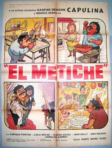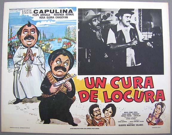 Colorful Mexican comedy movie poster features four comic-strip style images of the hefty comedian getting himself into trouble. Eye-catching design! There is some definite wear / separation along the fold lines, but this flaw is not too distracting. With linen-backing, or minor restoration, the flaw would virtually disappear. Even as is, the poster will still display pretty well... The film starred Gaspar 'Capulina' Henaine, Monica Serna, Enrique Ponton and Laila Novak. $30 |