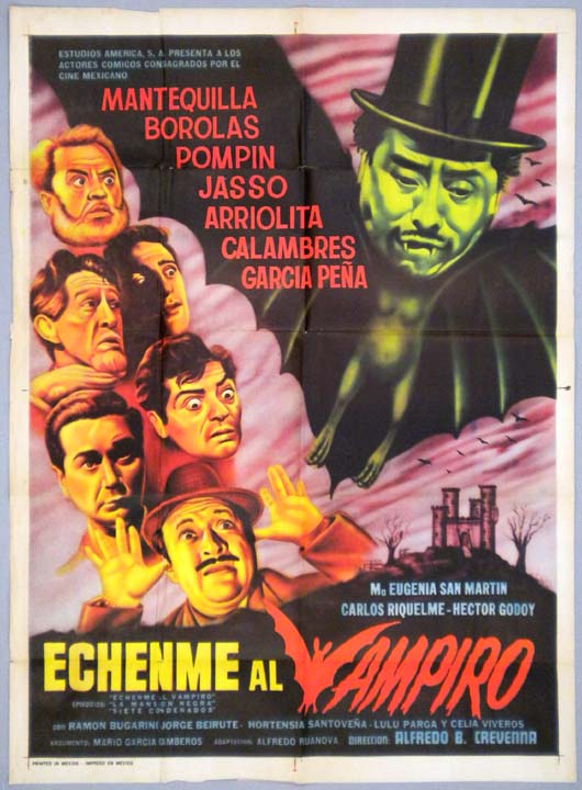 Beautiful horror film poster features a striking image of the south-of-the-border vampire -- this time sprouting wings! This was the second movie in this popular "Nostradamus" series. Great onesheet, as are all the posters from this series! The film was released in the USA as, Nostradamus and the Monster Demolisher. There is some light to moderate wear along the borders and fold lines, but no major flaws... This movie starred German Robles, Julio Aleman, Domingo Solar and Aurora Alvarado. $50 |