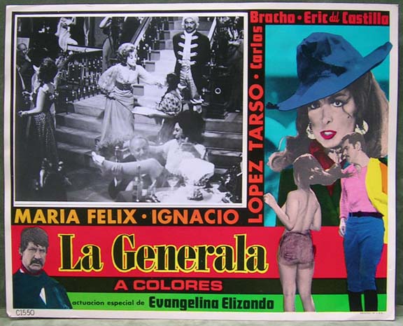 Beautiful historical / revolutionary film lobby card features a wonderful image of a whip-wielding Maria Felix on the color art. The B&W photo-scene has a scene from the film. The card has a number of pinholes -- mainly near the corner, plus a few other small scuffs/dings. However, these flaws are not too distracting, and otherwise, the colors are bright and the card will display well... This movie also starred Jorge Mistral, Luis Aguilar, Christiane Martell, Rita Macedo, Rene Cardona and Sonia Infante. $10 each |