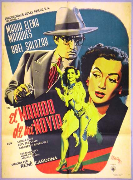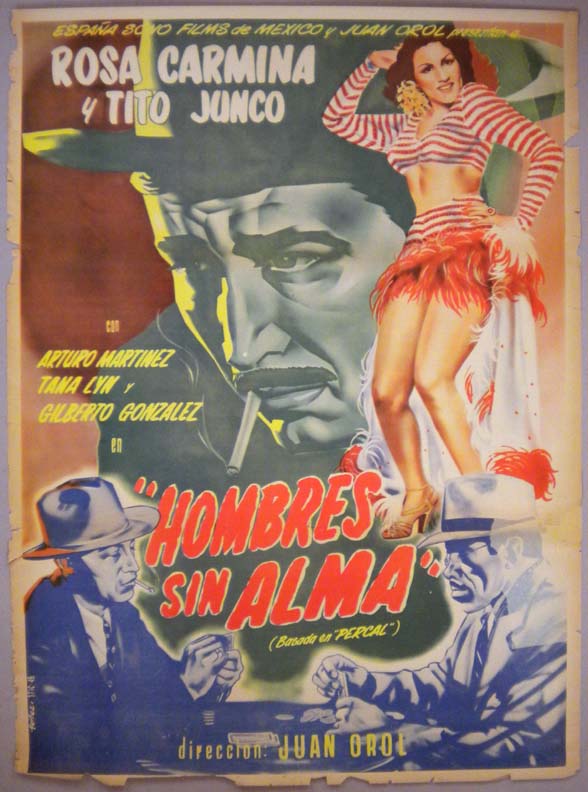 Wonderful film-noirish film poster with a striking design ... Armengod holding a dying Grin in his hands. There were several holes in the poster which someone has repaired poorly using masking tape on the back. Still, these flaws are not to distracting, and the poster will display well... This movie starred Ramon Armengod, Guillermina Grin, Tito Junco, Roberto Soto and Pedro Vargas. $40 |