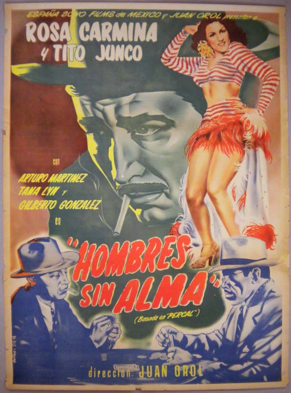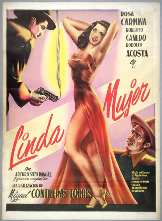 Stunning noir / crime film poster with art work that is simply perfect! The onesheet portrays classic elements of the film noir genre -- an incredibly sexy femme fatale and a thug holding a smoking gun. Out of hundreds of Mexican posters in my collection, this is one of only three that I have hanging on my wall! There is a small repaired tear coming in from the left edge and the purple background color seems to have faded to pink, but these flaws are not too distracting. The onesheet will display beautifully... The film starred Rosa Carmina, Roberto Canedo, Rodolfo Acosta and Arturo Soto Rangel. (This poster is rolled.) $50 |