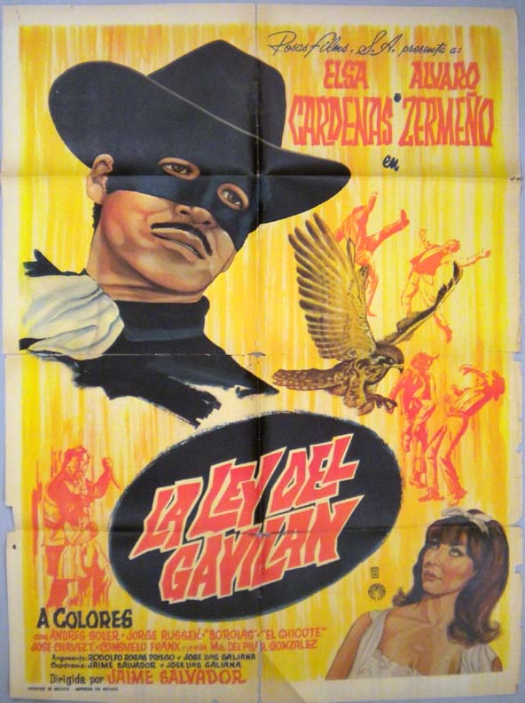 Colorful western film poster with a great close-up of a masked cowboys, surrounded by a montage of scenes from the film. The poster has heavy signs of use, including: extensive separations along the fold lines, edge wear, tears, border chips, and general surface marks/dings. However, the colors are still bright and if matted and framed, it will display pretty well... This movie starred Elsa Cardenas, Alvaro Zermeno, Andres Soler and Jorge Russek. $20 |
