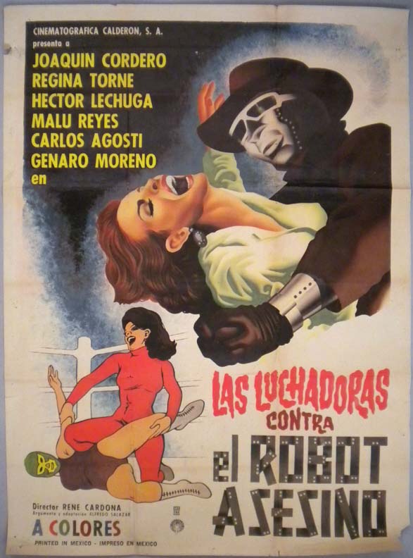 Striking sci-fi / lucha libre / horror film poster pictures fighting lady luchadoras, plus a fedora wearing killer robot!!! Final entry in the "Wrestling Women" series. A classic! The poster has seen heavy use and has wear including: Pinholes, fold wear, soiling, border wear, creases, tears, holes, surface wear. However, the flaws are not too distracting, and the poster will still display well... This movie starred Joaquin Cordero, Regina Torne, Hector Lechuga, Malu Reyes and Carlos Agosti. (This poster was at one folded, but it has been stored flat for quite a while, so it will be sent rolled.) $40 |